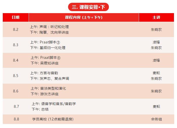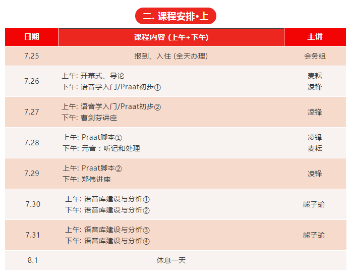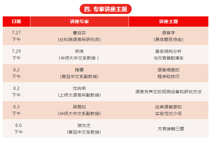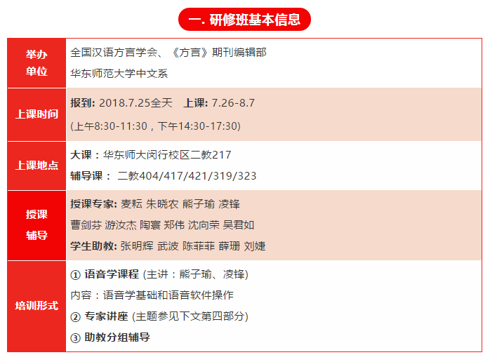 本次推送的是“2018田野語(yǔ)音學(xué)高級(jí)研修班”的課程安排,主要包括五部分:研修班基本信息、上半段課程、下半段課程、專家講座主題、漢語(yǔ)方言類型研討會(huì)簡(jiǎn)易日程。當(dāng)前日程僅為暫擬,如有變更,將及時(shí)告知,請(qǐng)各位研修班學(xué)員多加留意!