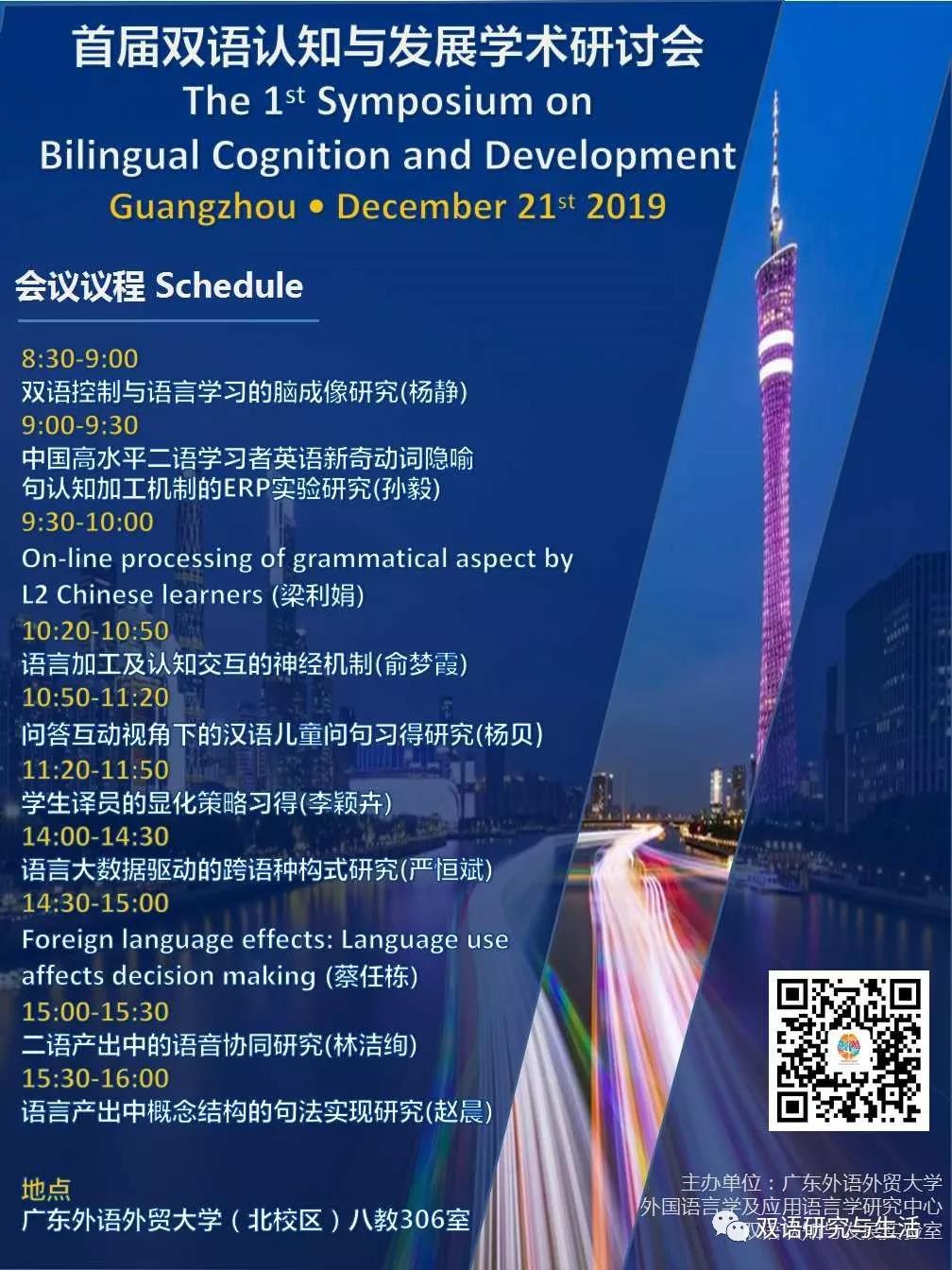 2019年12月21日,首屆雙語認(rèn)知與發(fā)展學(xué)術(shù)研討會(huì)將會(huì)在廣東外語外貿(mào)大學(xué)北校區(qū)第八教學(xué)樓306室舉行,歡迎大家前來聽會(huì)。議程詳見如下海報(bào):