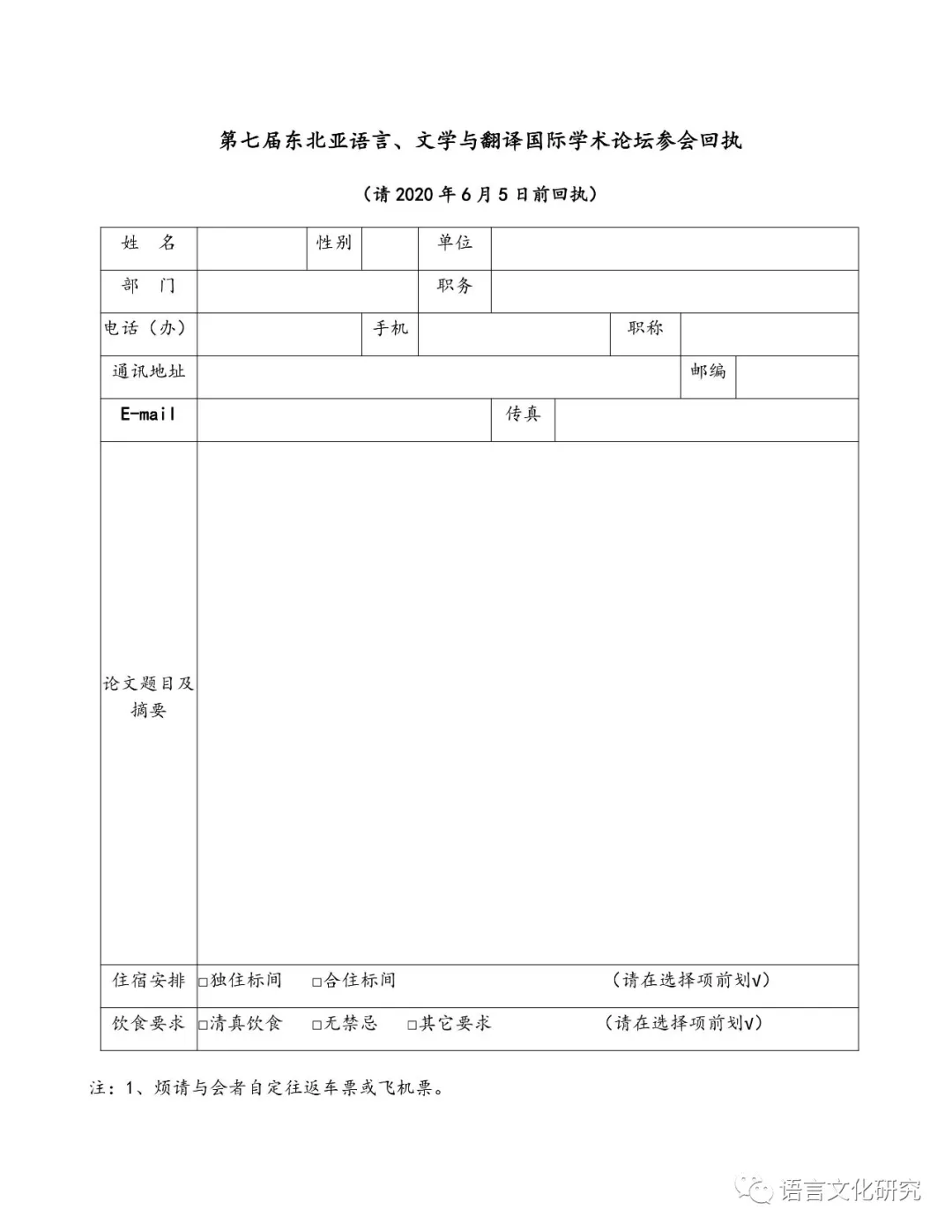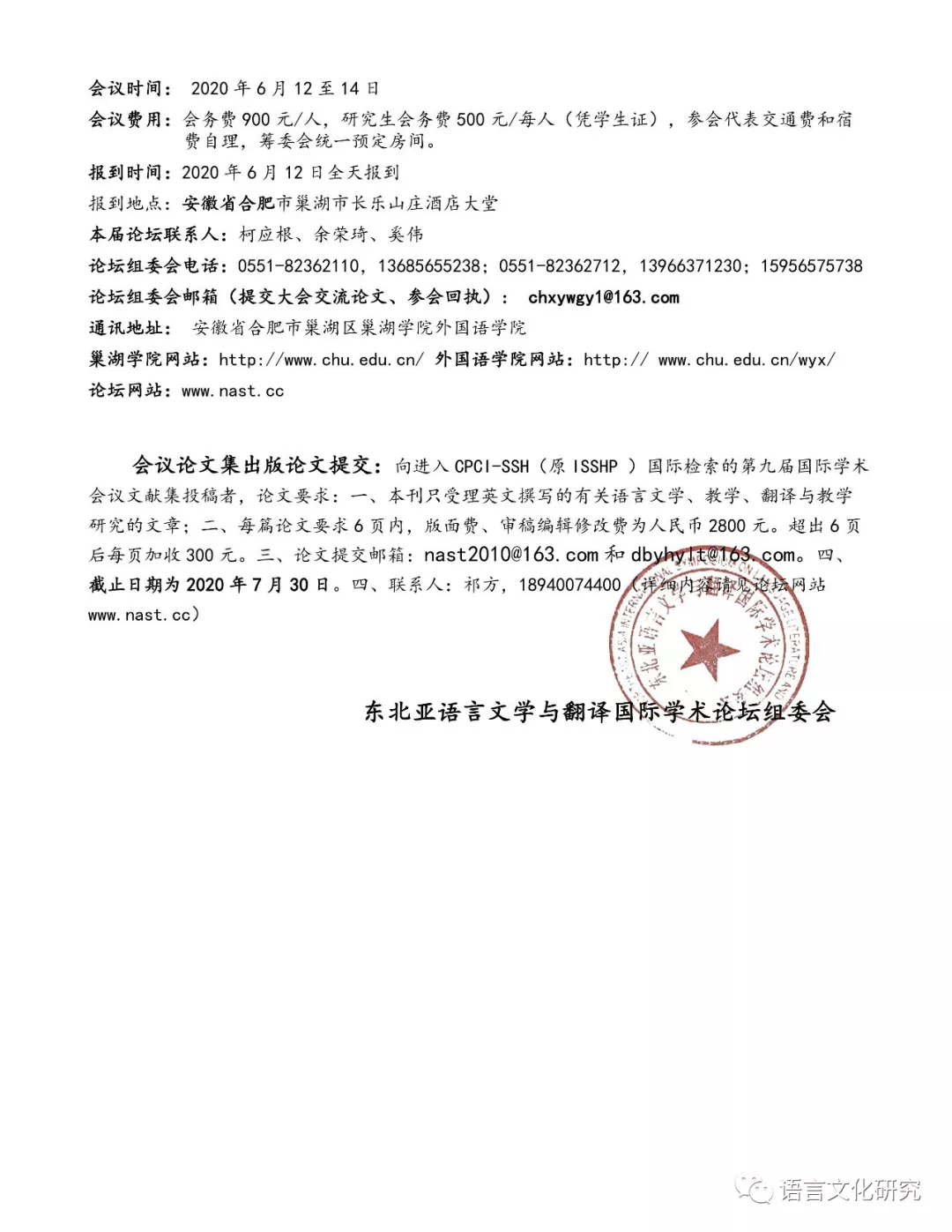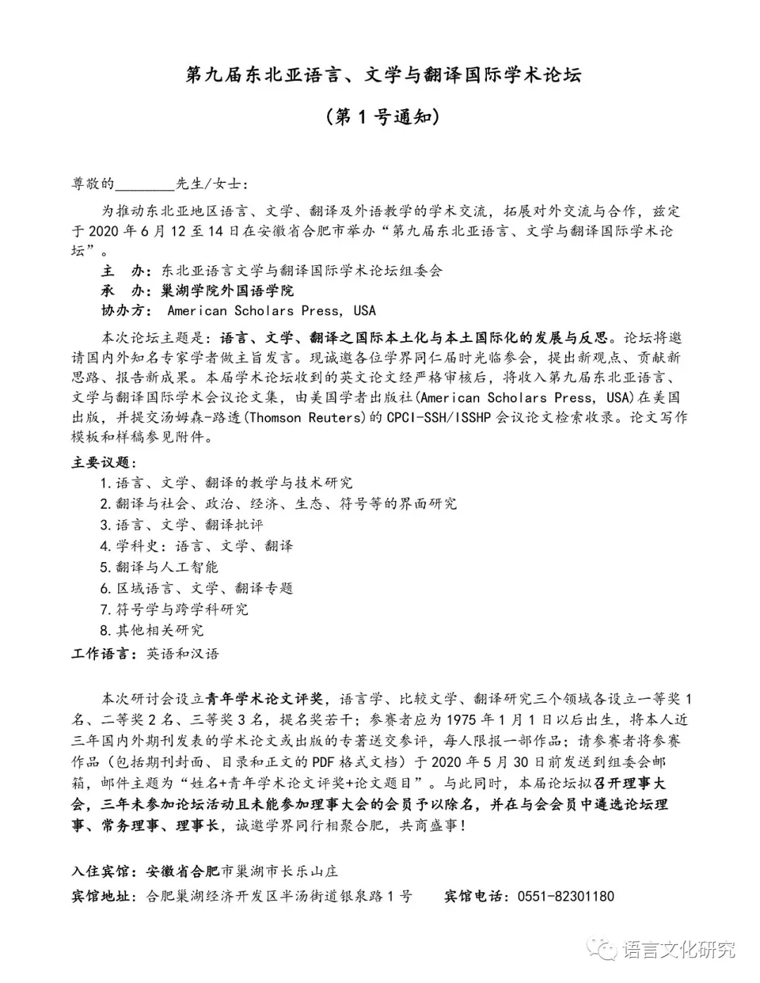 尊敬的________先生/女士: 為推動(dòng)?xùn)|北亞地區(qū)語(yǔ)言、文學(xué)、翻譯及外語(yǔ)教學(xué)的學(xué)術(shù)交流,拓展對(duì)外交流與合作,茲定于2020年6月12至14日在安徽省合肥市舉辦“第九屆東北亞語(yǔ)言、文學(xué)與翻譯國(guó)際學(xué)術(shù)論壇”。 主 辦:東北亞語(yǔ)言文學(xué)與翻譯國(guó)際學(xué)術(shù)論壇組委會(huì) 承 辦:巢湖學(xué)院外國(guó)語(yǔ)學(xué)院 協(xié)辦方: American Scholars Press, USA 本次論壇主題是:語(yǔ)言、文學(xué)、翻譯之國(guó)際本土化與本土國(guó)際化的發(fā)展與反思。論壇將邀請(qǐng)國(guó)內(nèi)外知名專(zhuān)家學(xué)者做主旨發(fā)言?,F(xiàn)誠(chéng)邀各位學(xué)界同仁屆時(shí)光臨參會(huì),提出新觀點(diǎn)、貢獻(xiàn)新思路、報(bào)告新成果。本屆學(xué)術(shù)論壇收到的英文論文經(jīng)嚴(yán)格審核后,將收入第九屆東北亞語(yǔ)言、文學(xué)與翻譯國(guó)際學(xué)術(shù)會(huì)議論文集,由美國(guó)學(xué)者出版社(American Scholars Press, USA)在美國(guó)出版,并提交湯姆森-路透(Thomson Reuters)的CPCI-SSH/ISSHP會(huì)議論文檢索收錄。論文寫(xiě)作模板和樣稿參見(jiàn)附件。 主要議題: 1.語(yǔ)言、文學(xué)、翻譯的教學(xué)與技術(shù)研究 2.翻譯與社會(huì)、政治、經(jīng)濟(jì)、生態(tài)、符號(hào)等的界面研究 3.語(yǔ)言、文學(xué)、翻譯批評(píng) 4.學(xué)科史:語(yǔ)言、文學(xué)、翻譯 5.翻譯與人工智能 6.區(qū)域語(yǔ)言、文學(xué)、翻譯專(zhuān)題 7.符號(hào)學(xué)與跨學(xué)科研究 8.其他相關(guān)研究 工作語(yǔ)言:英語(yǔ)和漢語(yǔ) 本次研討會(huì)設(shè)立青年學(xué)術(shù)論文評(píng)獎(jiǎng),語(yǔ)言學(xué)、比較文學(xué)、翻譯研究三個(gè)領(lǐng)域各設(shè)立一等獎(jiǎng)1名、二等獎(jiǎng)2名、三等獎(jiǎng)3名,提名獎(jiǎng)若干;參賽者應(yīng)為1975年1月1日以后出生,將本人近三年國(guó)內(nèi)外期刊發(fā)表的學(xué)術(shù)論文或出版的專(zhuān)著送交參評(píng),每人限報(bào)一部作品;請(qǐng)參賽者將參賽作品(包括期刊封面、目錄和正文的PDF格式文檔)于2020年5月30日前發(fā)送到組委會(huì)郵箱,郵件主題為“姓名+青年學(xué)術(shù)論文評(píng)獎(jiǎng)+論文題目”。與此同時(shí),本屆論壇擬召開(kāi)理事大會(huì),三年未參加論壇活動(dòng)且未能參加理事大會(huì)的會(huì)員予以除名,并在與會(huì)會(huì)員中遴選論壇理事、常務(wù)理事、理事長(zhǎng),誠(chéng)邀學(xué)界同行相聚合肥,共商盛事! 入住賓館:安徽省合肥市巢湖市長(zhǎng)樂(lè)山莊 賓館地址:合肥巢湖經(jīng)濟(jì)開(kāi)發(fā)區(qū)半湯街道銀泉路1號(hào) 賓館電話:0551-82301180 會(huì)議時(shí)間: 2020年6月12至14日 會(huì)議費(fèi)用:會(huì)務(wù)費(fèi)900元/人,研究生會(huì)務(wù)費(fèi)500元/每人(憑學(xué)生證),參會(huì)代表交通費(fèi)和宿費(fèi)自理,籌委會(huì)統(tǒng)一預(yù)定房間。 報(bào)到時(shí)間:2020年6月12日全天報(bào)到 報(bào)到地點(diǎn):安徽省合肥市巢湖市長(zhǎng)樂(lè)山莊酒店大堂 本屆論壇聯(lián)系人:柯應(yīng)根、余榮琦、奚偉 論壇組委會(huì)電話:0551-82362110,13685655238;0551-82362712,13966371230;15956575738 論壇組委會(huì)郵箱(提交大會(huì)交流論文、參會(huì)回執(zhí)): [email protected] 通訊地址: 安徽省合肥市巢湖區(qū)巢湖學(xué)院外國(guó)語(yǔ)學(xué)院 巢湖學(xué)院網(wǎng)站:http://www.chu.edu.cn/ 外國(guó)語(yǔ)學(xué)院網(wǎng)站:http:// www.chu.edu.cn/wyx/ 論壇網(wǎng)站:www.nast.cc 會(huì)議論文集出版論文提交:向進(jìn)入CPCI-SSH(原ISSHP )國(guó)際檢索的第九屆國(guó)際學(xué)術(shù)會(huì)議文獻(xiàn)集投稿者,論文要求: 一、本刊只受理英文撰寫(xiě)的有關(guān)語(yǔ)言文學(xué)、教學(xué)、翻譯與教學(xué)研究的文章; 二、每篇論文要求6頁(yè)內(nèi),版面費(fèi)、審稿編輯修改費(fèi)為人民幣2800元。超出6頁(yè)后每頁(yè)加收300元。 三、論文提交郵箱:[email protected]和[email protected]。 四、截止日期為2020年7月30日。 五、聯(lián)系人:祁方,18940074400(詳細(xì)內(nèi)容請(qǐng)見(jiàn)論壇網(wǎng)站www.nast.cc) 東北亞語(yǔ)言文學(xué)與翻譯國(guó)際學(xué)術(shù)論壇組委會(huì) 第七屆東北亞語(yǔ)言、文學(xué)與翻譯國(guó)際學(xué)術(shù)論壇參會(huì)回執(zhí) (請(qǐng)2020年6月5日前回執(zhí)) 姓 名 性別 單位 部 門(mén) 職務(wù) 電話(辦) 手機(jī) 職稱 通訊地址 郵編 E-mail 傳真 論文題目及摘要 住宿安排 □獨(dú)住標(biāo)間 □合住標(biāo)間 (請(qǐng)?jiān)谶x擇項(xiàng)前劃√) 飲食要求 □清真飲食 □無(wú)禁忌 □其它要求 (請(qǐng)?jiān)谶x擇項(xiàng)前劃√) 注:1、煩請(qǐng)與會(huì)者自定往返車(chē)票或飛機(jī)票。
