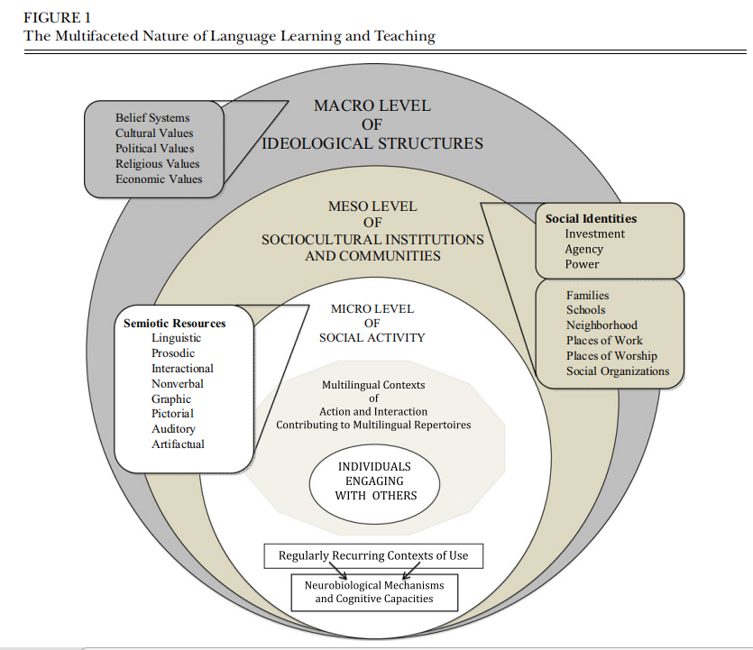 The Douglas Fir Group提出的框架受Bronfenbrenner的人類發(fā)展生態(tài)框架(ecological framework of human development)啟發(fā),內(nèi)容如下圖所示。二語(yǔ)習(xí)得是一個(gè)持續(xù)不斷的過程。它從社會(huì)活動(dòng)的微觀層面開始,表現(xiàn)為個(gè)人在多語(yǔ)情境中使用自己的神經(jīng)體制和認(rèn)知和情緒能力進(jìn)行活動(dòng)和交流。這些情境是處于中觀層面的社會(huì)文化機(jī)構(gòu)和社區(qū)之中的,比如家庭、宗教場(chǎng)所、政黨、在線論壇等等。值得一提的是,中觀層面的機(jī)構(gòu)和社區(qū)都深受社會(huì)政治、文化、宗教和政治情況的影響。最后,在宏觀層面,存在著社會(huì)范圍的意識(shí)形態(tài)結(jié)構(gòu),這影響著中觀層面和微觀層面對(duì)語(yǔ)言使用和學(xué)習(xí)的態(tài)度。圖中所示的三個(gè)層面雖然有各自的特征,但是它們并不是獨(dú)立存在的,它們彼此之間存在互動(dòng)。