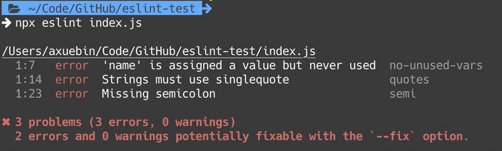 生成好配置文件之后,就可以執(zhí)行 ./node_modules/.bin/eslint index.js 或者 npx eslint index.js 命令對文件進行檢查。結(jié)果如下