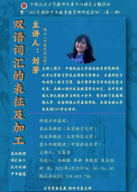 主講人:劉芳博士舉辦單位: 中國政法大學(xué)國際教育學(xué)院講座時間:2021/04/23 14:00騰訊會議:538 693 758
