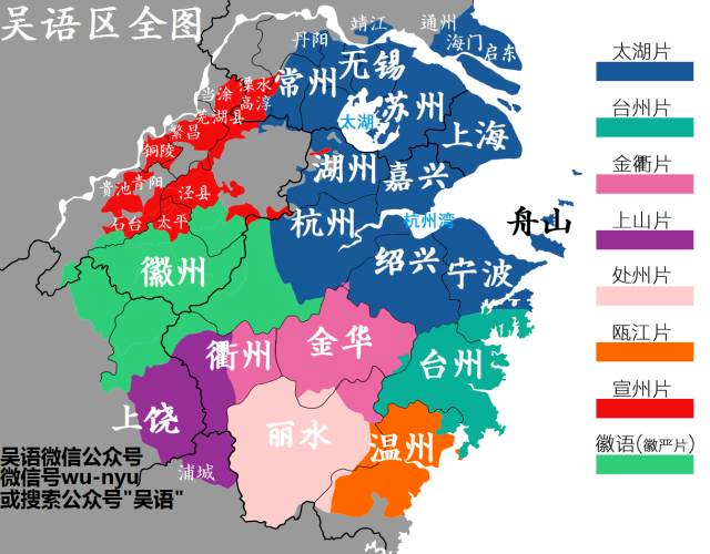 吳語(語言代碼:ISO 693-3 wuu)是一門歷史悠久的語言,通行于上海、浙江、江蘇南部、皖東南+贛東北邊界。其中上海、浙江北部大部分、江蘇南部大部分,同屬吳語最大的一個分片:吳語太湖片。(圖上所有泛藍色地區(qū))。包括了蘇州話、上海話、寧波話、常州話、紹興話、無錫話等一系列子方言。