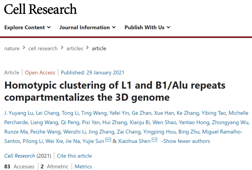 近日,來自清華大學(xué)的沈曉驊教授與北京大學(xué)的孫育杰教授團隊合作在Cell Research 雜志發(fā)表一篇題為 Homotypic clustering of L1 and B1/Alu repeats compartmentalizes the 3D genome 的文章,對基因組重復(fù)序列如何影響細胞核區(qū)隔化提供了進一步分子依據(jù)。
