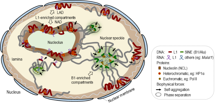 總的來說,這項研究綜合利用生物信息分析、熒光標(biāo)記顯微成像、體外相分離體系重構(gòu)等方法揭示了基因組重復(fù)序列L1和B1/Alu在compartments層面上組織染色質(zhì)高級結(jié)構(gòu)形成的分子機制,為深入理解小鼠和人之間高度保守的染色質(zhì)區(qū)隔化結(jié)構(gòu)提供了重要依據(jù)。該研究還提出了一個染色質(zhì)高級結(jié)構(gòu)的遺傳編碼機制:相同類型的重復(fù)序列相互聚集(Homotypic clustering),不同類型的重復(fù)序列相互排斥(Heterotypic segregation),這種基因組重復(fù)序列的作用模式作為先決條件奠定了染色質(zhì)高級結(jié)構(gòu)形成的基礎(chǔ);其次,重復(fù)序列以及其轉(zhuǎn)錄本的結(jié)合蛋白進一步調(diào)控了染色質(zhì)高級結(jié)構(gòu)的建立;與此同時,細胞核內(nèi)無膜包被的液液相分離小體為染色質(zhì)高級結(jié)構(gòu)的建立提供了另外一個層面的相互作用平臺。