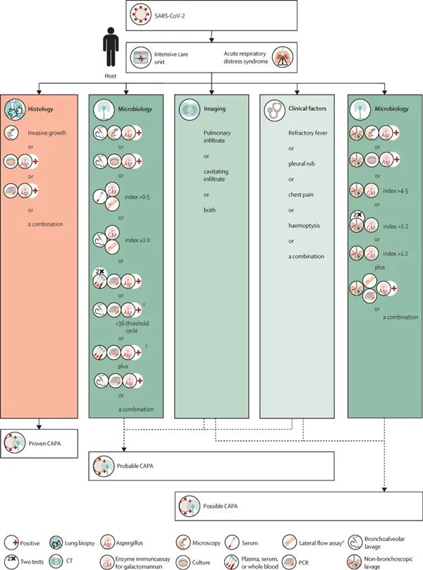 曠日持久的新冠病毒還在全球肆虐橫行,與此同時(shí)人們逐漸發(fā)現(xiàn)新冠病毒引起的肺曲霉病更為致命。為此,國際真菌學(xué)界緊急行動(dòng),快速撰寫關(guān)于新冠病毒感染相關(guān)侵襲性肺曲霉管理的全球共識(shí),對(duì)其定義、診斷標(biāo)準(zhǔn)、鑒別診斷、實(shí)驗(yàn)室檢查和治療等方面進(jìn)行全方位的歸納、總結(jié),并對(duì)該病的早期診斷和治療策略制訂指導(dǎo)性建議,該共識(shí)Defining and managing COVID-19-associated pulmonary aspergillosis: the 2020 ECMM/ISHAM consensus criteria for research and clinical guidance于2020年12月在線發(fā)表,很快就得到各國專家的高度重視,并被廣泛引用。