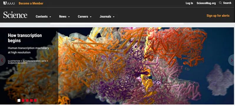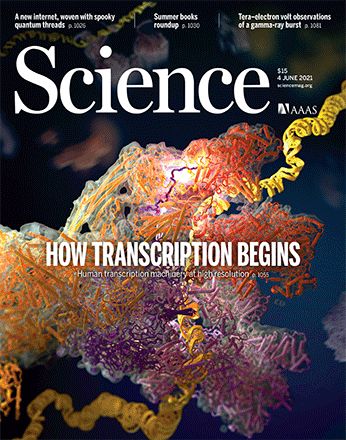 Science 雜志封面:人源轉(zhuǎn)錄前起始復(fù)合物(PIC;粉色和紅色)和多亞基的中介體復(fù)合物(橘黃色,左邊)在DNA的啟動(dòng)子區(qū)域(黃色卷曲,中間)組裝成超級(jí)復(fù)合物(76個(gè)多肽,總分子量為4.1兆道爾頓)起始基因轉(zhuǎn)錄。在PIC中,中介體結(jié)合到RNA聚合酶II(紫色)并激活C末端結(jié)構(gòu)域(白色),這是轉(zhuǎn)錄起始的關(guān)鍵事件。
