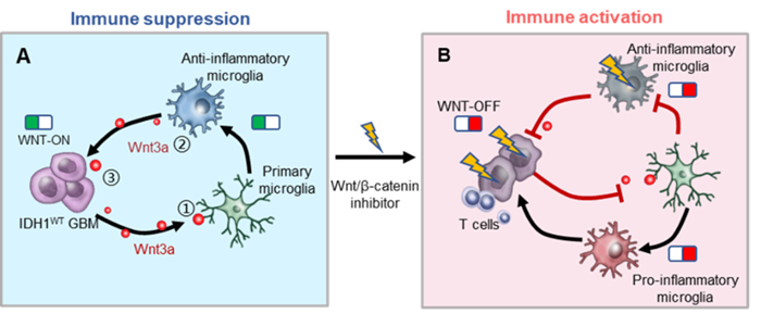 該工作發(fā)現(xiàn)了Wnt/β-catenin信號(hào)通路在維持膠質(zhì)瘤免疫抑制微環(huán)境中的重要作用。抑制Wnt/β-catenin信號(hào)通路能夠切斷抑炎表型小膠質(zhì)細(xì)胞和IDH1WT膠質(zhì)瘤細(xì)胞間聯(lián)絡(luò),激活膠質(zhì)瘤免疫響應(yīng),延長小鼠生存期。