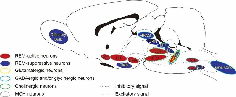 6月15日,腦科學(xué)研究院黃志力課題組在Progress in Neurobiology 雜志發(fā)表文章,在總結(jié)課題組REM睡眠機(jī)制相關(guān)研究的基礎(chǔ)上,綜述了REM睡眠調(diào)控模型新進(jìn)展,包括交互作用模型、極限環(huán)模型、觸發(fā)器模型等。如附圖所示,在REM睡眠調(diào)控中,下外背側(cè)被蓋核(Sublaterodorsal tegmental nucleus,SLD)中的谷氨酸能神經(jīng)元起關(guān)鍵作用。外背側(cè)被蓋核(Laterodorsal tegmental nucleus, LDT)和腦橋被蓋核(Pedunculopontine tegmental nucleus, PPT)的膽堿能神經(jīng)元,外側(cè)旁巨細(xì)胞核(Lateral paragigantocellular nucleus, LPGi)、背側(cè)旁巨細(xì)胞核(Dorsal paragigantocellularnucleus, DPGi)、中腦導(dǎo)水管周圍灰質(zhì)腹外側(cè)部(Ventrolateral periaqueductal gray, vlPAG)、腦橋被蓋外側(cè)部(Lateral pontine tegmentum,LPT)及脊髓中γ-氨基丁酸能神經(jīng)元在REM睡眠的維持和肌肉松弛中發(fā)揮調(diào)節(jié)作用。腦內(nèi)REM睡眠活躍神經(jīng)元興奮后直接或間接抑制REM抑制神經(jīng)元,啟動(dòng)和維持REM睡眠。