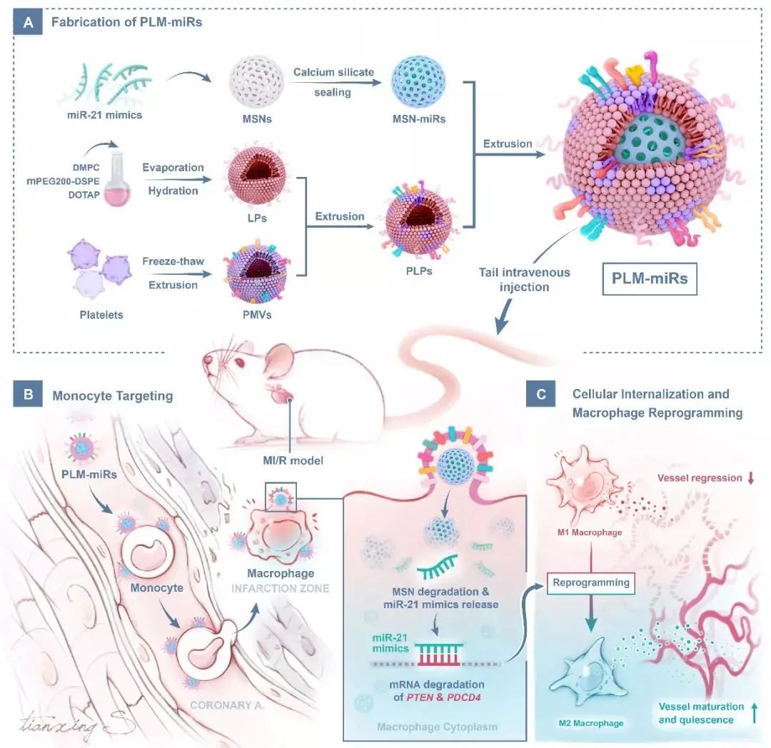 中山醫(yī)院心內(nèi)科葛均波院士、黃浙勇主任醫(yī)師和復(fù)旦大學(xué)藥學(xué)院龐志清副研究員合作開發(fā)了一種全新的RNA納米靶向遞送平臺(tái),用于調(diào)控心肌梗死后炎癥反應(yīng),改善心肌重構(gòu)。相關(guān)成果于6月17日以《血小板樣膜融合脂質(zhì)體介導(dǎo)的 miR-21 靶向遞送通過重編程心肌缺血再灌注損傷后巨噬細(xì)胞以改善心肌重構(gòu)》(Platelet-like fusogenic liposome-mediated targeting delivery of miR-21 improves myocardial remodeling by reprogramming macrophages post myocardial ischemia-reperfusion injury)為題在線發(fā)表于材料科學(xué)與工程技術(shù)領(lǐng)域國際著名期刊Advanced Science上。