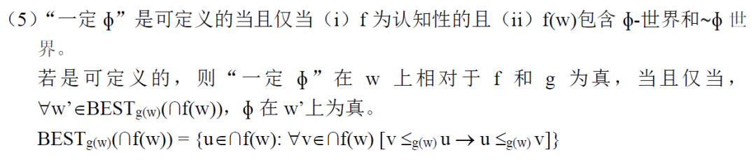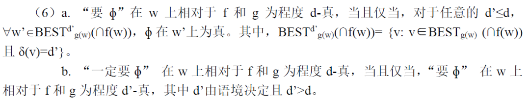 也就是說,"一定?"為真需要?在所有的最佳世界中都為真。另外,條件(i)保證了情態(tài)詞“一定”只能表達認知情態(tài),條件(ii)保證了認知情態(tài)詞對間接證據(jù)的要求(requirement of indirectness,參見Lassiter 2016)。
