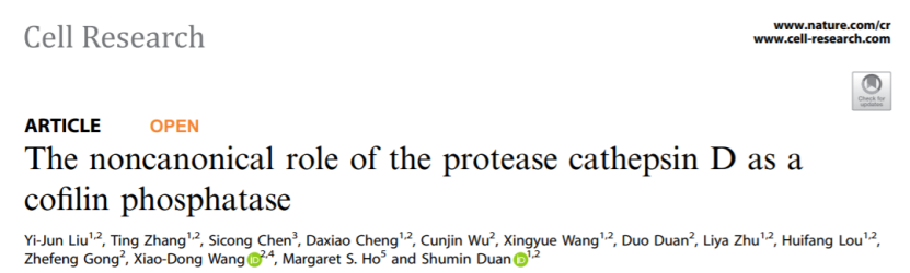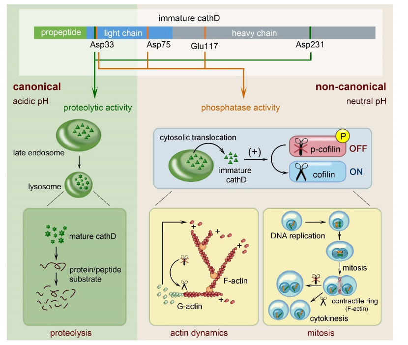 溶酶體中存在多種負責降解多肽或蛋白質(zhì)的蛋白水解酶。為確保它們在特定部位與環(huán)境發(fā)揮催化作用、避免“濫殺無辜”,蛋白水解酶通常以酶原的形式在囊泡內(nèi)大量儲存。在傳統(tǒng)認識中,酶原是不具有催化活性的前體蛋白。然而,酶原在功能上真的只是“沉默的大多數(shù)”嗎? 2021年1月29日,浙江大學醫(yī)學院段樹民院士團隊在Cell Research雜志上發(fā)表文章The noncanonical role of the protease cathepsin D as a cofilin phosphatase,發(fā)現(xiàn)溶酶體蛋白水解酶cathepsin D的酶原蛋白具有pH和構象雙重依賴的非經(jīng)典磷酸酶活性。