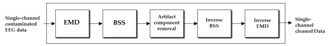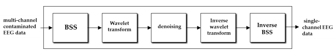 所謂混合方法就是結(jié)合信號分解方法和盲源信號分離來處理腦電信號,排列組合一下有很多種方法可以選擇,例如Wavelet/EMD+ICA/CCA。現(xiàn)在腦電信號降噪效果最好的方法也是上述降噪方法的排列組合,如下圖所示。