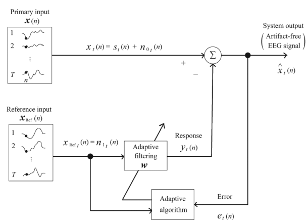 自適應(yīng)濾波假設(shè)腦電信號和噪聲無關(guān),記作 ,其中x是原始腦電信號,S是干凈腦電信號,n是噪聲信號。使用自適應(yīng)濾波最重要的是設(shè)置參考電極,估計濾波參數(shù)W使得降噪后的腦電信號接近參考電極。估計濾波參數(shù)W的算法是自動控制領(lǐng)域常用的最小二乘法(Least Mean Squares, LMS)或遞歸最小二乘(Recursive Least Mean Squares, RLMS),使得矯正后的腦電信號與參考電極信號越來越接近,也就是讓二者誤差e越來越小,進而達到濾波的效果。