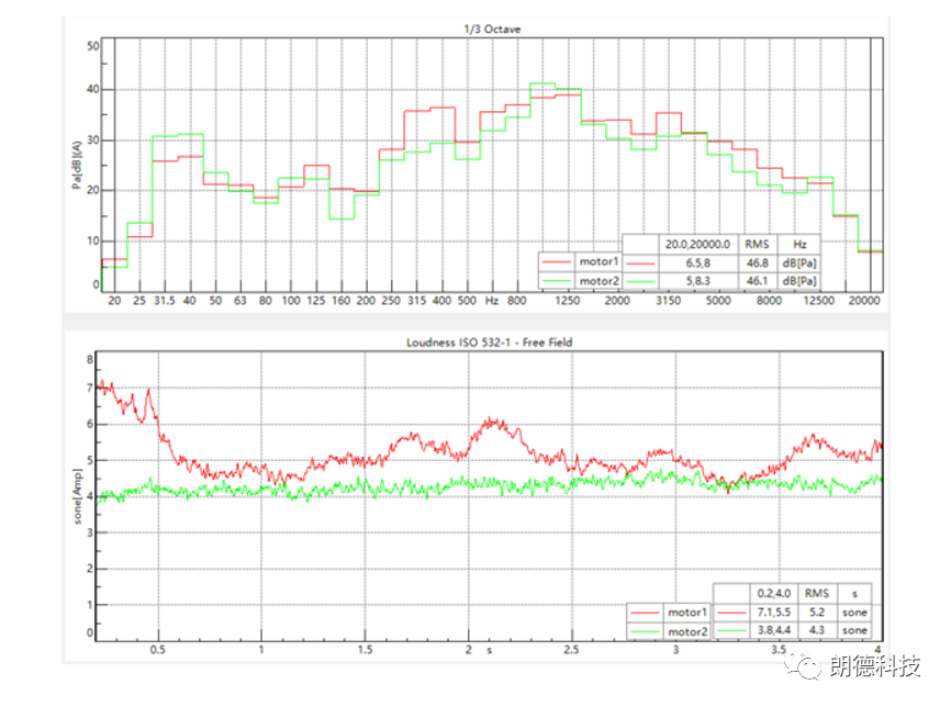 下面兩個(gè)小電機(jī)是同一型號(hào)、不同批次的汽車座椅電機(jī)(圖9),聲壓級(jí)只相差0.7dB,(一般相差2dB以內(nèi)人耳幾乎聽(tīng)不出差別);但利用響度分析(圖10)卻能看出較大的差別:雖然聲壓級(jí)差不多,但電機(jī)1比電機(jī)2大了接近1sone。