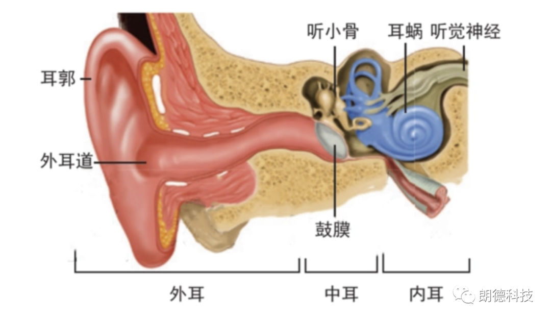 人的耳朵是由外耳、中耳和內(nèi)耳三部分組成的(圖2),每個(gè)結(jié)構(gòu)都有其不用的組成和生理功能。外耳由耳廓和外耳道構(gòu)成,主要功能就是收集聲波、聲源定位(通過(guò)雙耳實(shí)現(xiàn))、傳遞聲音到中耳、對(duì)聲波增壓。中耳主要是鼓膜和聽(tīng)小骨組成,經(jīng)過(guò)鼓膜的振動(dòng)傳導(dǎo)聲波,聽(tīng)小骨也有擴(kuò)音的作用。內(nèi)耳主要由耳蝸和聽(tīng)覺(jué)神經(jīng)組成,將聲音振動(dòng)轉(zhuǎn)化成生物能,傳遞給大腦。