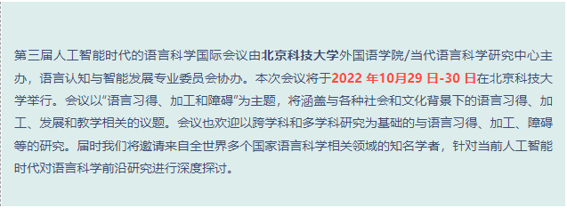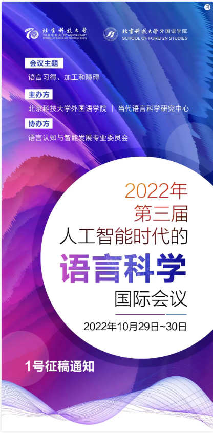 一、會議主題 1.語言習(xí)得、發(fā)展和加工的認知神經(jīng)心理學(xué)視角 2.人工智能在語言研究中的應(yīng)用 3.語言-言語障礙的特征、診斷和干預(yù) 4.口筆譯在線加工與教學(xué)研究 5.雙語發(fā)展和影響因素研究 6.語言學(xué)習(xí)和教育中的心理學(xué)研究 7.其他相關(guān)主題 二、論壇形式 本次會議擬設(shè)立以下論壇形式: 1)大會報告。在開幕式后和閉幕式前進行,由國內(nèi)、外心理語言學(xué)及相關(guān)領(lǐng)域的專家做主旨報告。 2)專題論壇。為 90-180 分鐘的專題研討,集中圍繞某一研究問題,進行系列論文報告。有意組織專題論壇的老師請在 2022 年 6 月 30 日前把專題題目、摘要和參加人員名單在線提交或發(fā)給會務(wù)組,以便得到會議組織者的協(xié)助。 3)分組口頭報告。每位與會代表圍繞相關(guān)話題進行 20 分鐘的論文宣讀與交流。 4)研究生論壇。除論文宣讀之外,研究生還可以另外就自己感興趣但還沒有完善的論文進行匯報,會務(wù)組將安排本領(lǐng)域?qū)<依蠋熃o予指導(dǎo)。 三、論文要求 1)會議接收未在國內(nèi)外學(xué)術(shù)刊物上公開發(fā)表過的原創(chuàng)性論文摘要。 2)每位作者以第一作者身份只能提交一篇摘要,通訊作者不限。 3)可投中文摘要(300-500 字)或者英文摘要(200-350 字),統(tǒng)一用word 文檔格式。具體格式要求請參照論文投稿模板。 4)請在摘要中詳細標(biāo)明作者姓名、作者單位名稱、電子郵箱(Email)等。 四、論文摘要提交和接收程序 1)訪問“2022 年第三屆人工智能時代的語言科學(xué)國際會議”會議網(wǎng)站。網(wǎng)站地址為: http://sfs.ustb.edu.cn/cn/index.html 2)初次訪問請先使用個人真實信息“注冊”。注冊完“登錄”進入平臺后,點擊“摘要提交”。 3)論文投稿截止日期:需要簽證的境外學(xué)者為 2022 年 7 月 30 日;其他學(xué)者為 2022 年 8 月 30 日。逾期將無法投稿。通過下面的鏈接或微信二維碼報名并發(fā)送摘要: A) 點擊以下鏈接: https://www.wjx.cn/vj/QAE0bG6.aspx B) 掃描微信二維碼: 4)論文提交截止日期過后,學(xué)會將組織專家對論文摘要進行篩選審定,決定錄用名單,需要簽證的境外學(xué)者的參會邀請將在 2022 年 8 月 15 日前發(fā)出,其他學(xué)者的參會邀請將在 2022 年 9 月 15 日前發(fā)出。 五、會議費用 本次會議不收會務(wù)費。但收到錄用通知的與會代表請務(wù)必在 9 月 30 日之前完成網(wǎng)上注冊,大會將根據(jù)網(wǎng)上注冊名單確定會議手冊。 六、聯(lián)系方式 電子郵箱:[email protected]; 聯(lián)系人:湯小藝(電話:18610871269) 有關(guān)本次會議的最新信息還將在北京科技大學(xué)外國語學(xué)院網(wǎng)站(http://sfs.ustb.edu.cn/cn/index.html)刊出,敬請關(guān)注。