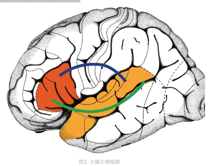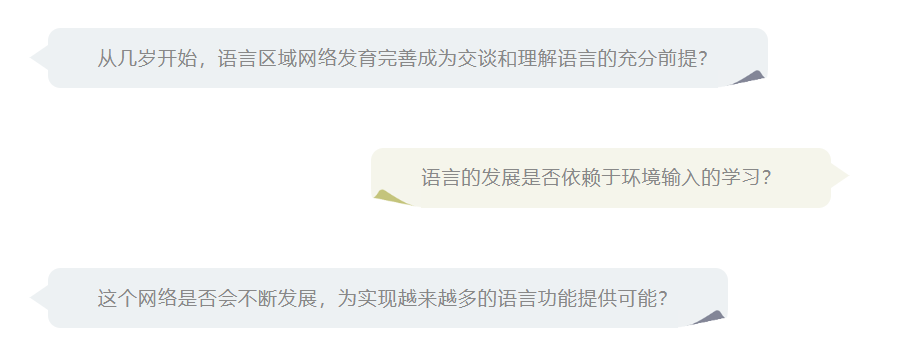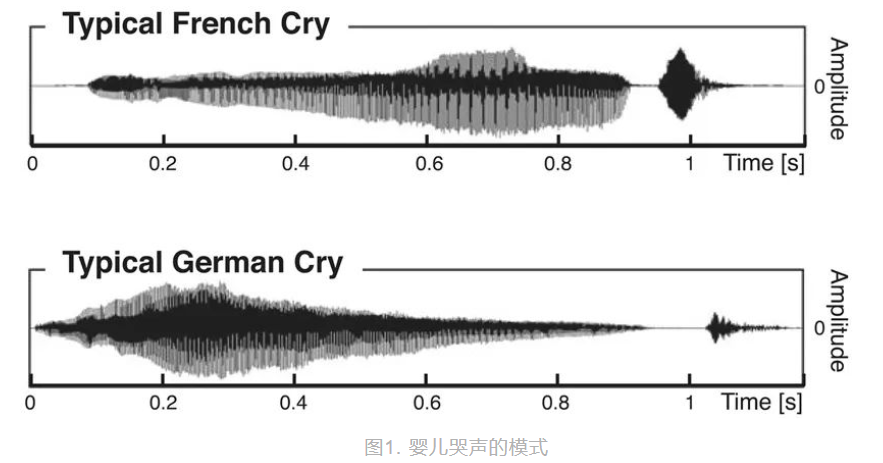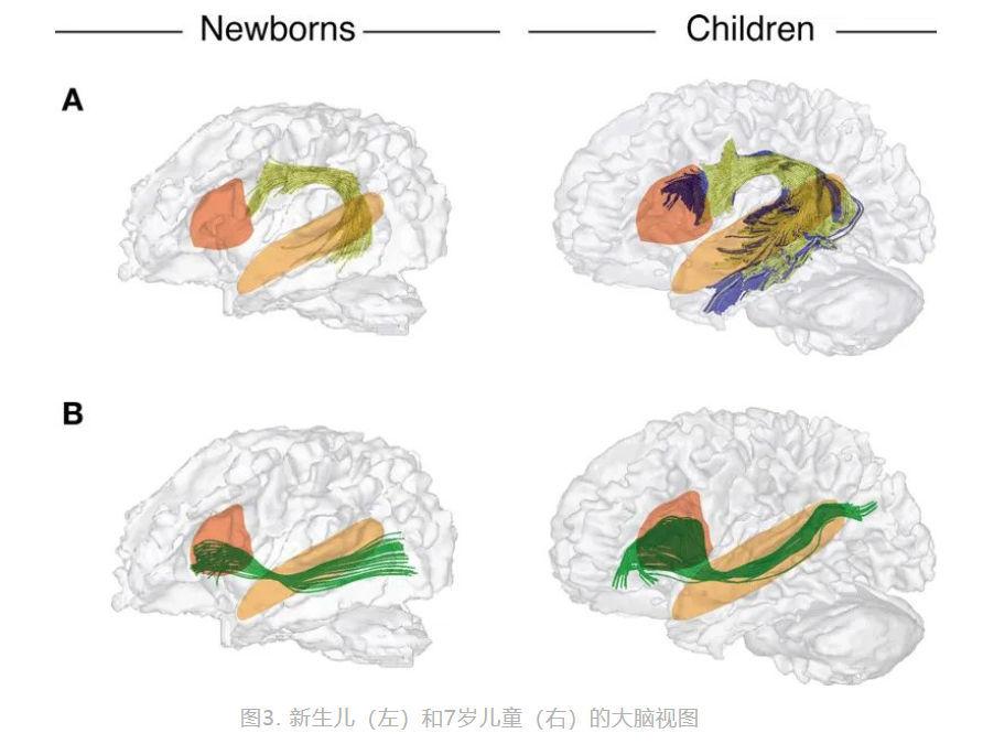 所有這些類型的交流都需要我們組織語言,才能將信息傳達給另一個人。幼兒從很早就開始使用語言,他們的語言能力發(fā)展很快,但是我們是如何學會理解語言的呢? 語言習得的第一步是什么?從嬰兒期到兒童期語言如何 發(fā)展?我們的大腦中是否有某些支持語言習得的前提條件? 以及一個重要的問題是, 為什么語言 這么重要? 能夠理解和表達語言對我們來說是一個巨大的優(yōu)勢,因為我們能夠非??焖?、準確地交換信息。當我們記錄下一些信息時,它們甚至能傳遞幾個世紀;當我們交談時,我們可以談論 面前的事物、或是遙遠的事物、或剛出現(xiàn)的事物、或是已經存在或將要出現(xiàn)的事物,甚至是在現(xiàn)實世界中從未存在、也永遠不會存在的事物;我們甚至可以談論交談本身,或者撰寫文章來教別人如何利用大腦實現(xiàn)這種驚人的能力——因為大腦正是我們組織和理解語言的部位。語言是我們擁有的最驚人的能力之一。 嬰兒出生時不會說話,也聽不懂別人說的話,這個時期的交流通常是基本的且非語言的。嬰兒是從與他人的互動中掌握語言的,在一歲時他們能說出自己的第一個單詞并且很快就能說出完整的句子,再過兩、三年就能非常擅長言語交流,并且能說出自己想要什么了——這種快速進步可能受到快速語言學習的遺傳條件支持。 有趣的是,在出生之前嬰兒就已經在語言發(fā)展方面邁出了第一步[1],出生時他們已經熟悉了母語的聲調和旋律,能夠按照語言的模式“說話”了,當然這種“說話”不涉及單詞。新生兒發(fā)出的通常是哭泣的聲音,你可能會認為所有嬰兒的哭聲聽起來都差不多 ,但實際上嬰兒的哭泣聲遵循一定的規(guī)律??茖W家們研究了德國和法國新生兒的哭聲[2],他們發(fā)現(xiàn)兩個國家的嬰兒是有區(qū)別的!從圖1中可以看到,法國嬰兒在開始時表現(xiàn)出低強度的哭聲,然后上升;德國嬰兒在開始時表現(xiàn)出高強度的哭聲,然后下降——這些哭泣的規(guī)律類似于人們說法語或德語時的語調:德語是一種在開頭強調單詞的語言,而法語則在其結尾強調單詞。例如,德語中的“爸爸”第一個音節(jié)重讀:pa pa ,而法語中的“爸爸”第二個音節(jié)重讀: pa pa 。這個發(fā)現(xiàn)表明,法國和德國新生兒的啼哭聲遵循本國語言的重音模式!這兩張圖中的黑色部分顯示了1.2秒內聲音的強度變化,曲線越寬(即振幅越大)聲音越強烈。上圖顯示了法國新生兒典型哭聲的聲音模式:哭聲的最高強度在末尾(右邊);下圖顯示了德國新生兒典型哭聲的聲音模式:與法國新生兒不同,哭聲在開始時更強烈(從左到右下降)。這兩種不同的哭聲類似于法語和德語這兩種語言的聲音,似乎在出生前他們就已經學會了。 嬰兒如何在出生前學習母語的旋律和聲調呢?答案很簡單: 嬰兒在出生前大約三個月時就已經開始聽到聲音,那時他們的耳朵已經充分發(fā)育并開始工作。 通常,到達子宮內的聲音大部分來自母親,但其他大的環(huán)境聲音或音效也能到達。因此,在出生前最后幾個月,胎兒就能聽到人們的對話了——這是語言學習的第一步!換句話說, 語言學習 的第一步是在胎兒期開始學習語言的旋律,后來在出生后的幾個月至幾年中,逐漸學會了語言的其他功能,例如單詞的含義或完整句子的形成。 嬰兒器官的發(fā)育是語言習得的重要前提,也許是因為聽覺系統(tǒng)的發(fā)展使嬰兒能夠從子宮中聽到語言的聲音,但是大腦的同步發(fā)展同樣重要,為嬰兒提供了學習和發(fā)展新技能的能力。大腦的特定部分負責理解單詞和句子,這些區(qū)域主要位于大腦的左側,它們相互“連接”形成了一個網(wǎng)絡(圖2),彼此之間進行信息交換,是大腦中的語言發(fā)展的“硬件”。沒有這個大腦網(wǎng)絡,我們將無法交談、無法理解人們在說什么。 紅色和橙色大腦區(qū)域主要參與處理語音和語言,藍線和綠線說明了兩個區(qū)域相互“連接”形成語言區(qū)域網(wǎng)絡,有一個上行神經連接(藍色)和一個下行神經連接(綠色)。 這些問題可以通過研究大腦中的神經纖維連接來回答。 神經纖維是大腦的關鍵部分,可以通過磁共振成像(MRI)技術觀察到它們 (有關MRI的更多科普介紹,歡迎查閱本欄目的相關文章)。 現(xiàn)在使用這種技術,研究人員比較了新生兒和兒童(例如已經上學的7歲孩子),觀察他們的大腦網(wǎng)絡是否相同(圖3),如果相同,意味著從出生起大腦中就存在語言習得的前提條件;如果它們不同,則意味著在出生時大腦的某些語言習得的前提可能尚未完全具備,這些前提也許時隨著嬰兒年齡增長而逐漸出現(xiàn)的。 紅色和橙色突出顯示了大腦的兩個重要語言區(qū)域,MRI可觀察到兩種語言區(qū)域之間神經連接,在新生兒和兒童中,這些區(qū)域由下行神經連接(B,綠色);在兒童語言區(qū)域之間可以觀察到上行神經連接(A,藍色),而在嬰兒中尚未觀察到;但是嬰兒已經存在直接相鄰區(qū)域之間的連接(A,黃色)。這些觀察結果意味著嬰兒的語言網(wǎng)絡尚未完全建立,上行神經的重要連接仍需日后的發(fā)展;另一方面,兒童已經與成年人的網(wǎng)絡非常相似,顯示存在上行神經連接與下行神經連接。 可以看出,新生兒和學齡兒童的大腦 語言區(qū)域之間都已經存在連接網(wǎng)絡:新生兒可以使用語言網(wǎng)絡內的基本連接(圖3B中的綠色),這就是一個