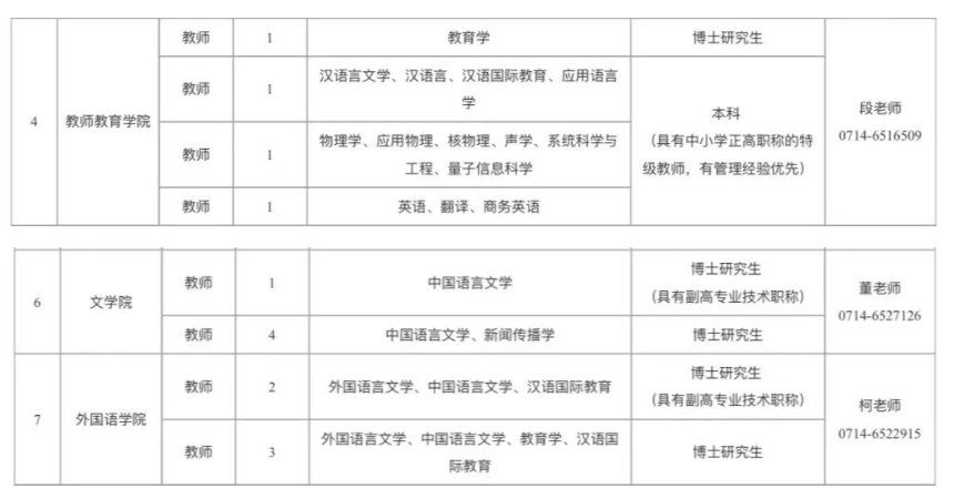 有意應(yīng)聘者,請(qǐng)將個(gè)人簡(jiǎn)歷、相關(guān)證明材料以附件形式發(fā)送至學(xué)校招聘郵箱,郵件主題格式統(tǒng)一為:應(yīng)聘XX二級(jí)單位+專業(yè)方向+學(xué)歷+畢業(yè)院校+高校人才網(wǎng),例:應(yīng)聘經(jīng)管學(xué)院+工商管理+博士+武漢大學(xué)+高校人才網(wǎng)。1.聯(lián)系單位:湖北師范大學(xué)教師工作部、人事處2.聯(lián)系電話:0714-6575256