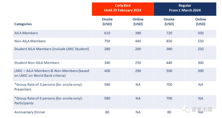 AILA World Congress is the biggest event in Applied Linguistics, bringing together more than 1,500 researchers and practitioners from all areas of Applied Linguistics.The Congress is characterized by high level presentations and discussions on key issues in the field. Its format includes keynote addresses, plenary speeches by outstanding scholars, invited symposia, symposia, individual papers and poster presentations.AILA 2024 is the perfect platform for your company to showcase your products and services, as well as increasing brand awareness. There are plenty of networking opportunities with the international experts and participants in linguistics filed. Find out more on sponsorship opportunities available to accommodate your needs and budget.* REGISTRATION FEES ABOVE ARE PER PERSON BASIS.