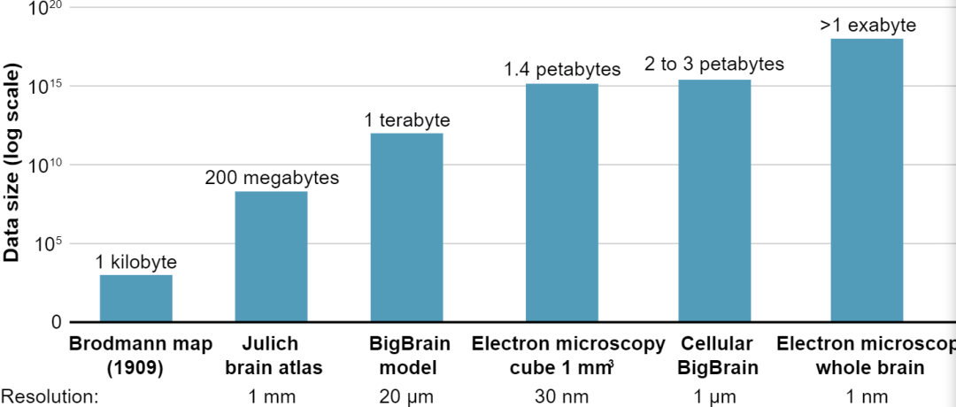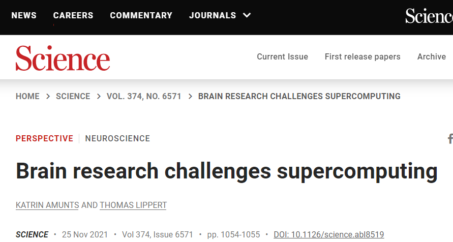Katrin Amunts 和 Thomas Lippert 在《Science》發(fā)表「Brain research challenges supercomputing」為題的觀點(diǎn)論文。人類大腦包含約 860 億個(gè)神經(jīng)元。放大其細(xì)胞和亞細(xì)胞細(xì)節(jié),揭示神經(jīng)元連接的不同方面,是一個(gè)重要的研究領(lǐng)域。然而,將突觸水平(納米范圍)到單個(gè)神經(jīng)元和神經(jīng)膠質(zhì)細(xì)胞(微米水平)的不同空間尺度連接到整個(gè)器官是最具挑戰(zhàn)性的。最近,秀麗隱桿線蟲的連接組具有 302 個(gè)神經(jīng)元的特征,并提出了完整的結(jié)構(gòu)功能模型。人類大腦連接組的類似細(xì)節(jié)水平還有很長的路要走。因此,解碼人類連接組、信號(hào)轉(zhuǎn)導(dǎo)機(jī)制以及與大腦功能的關(guān)系,與先進(jìn)計(jì)算和存儲(chǔ)技術(shù)中呈指數(shù)增長的挑戰(zhàn)有關(guān),這反過來可能會(huì)導(dǎo)致神經(jīng)科學(xué)之外的創(chuàng)造性解決方案。掃描時(shí)間、存儲(chǔ)技術(shù)和數(shù)據(jù)處理的挑戰(zhàn)并非始于人類大腦的研究,而是研究脊椎動(dòng)物甚至無脊椎動(dòng)物的大腦時(shí)的重要考慮因素(見圖)。例如,重建具有約 100,000 個(gè)神經(jīng)元的成年果蠅大腦的突觸連接,最終生成了約 2100 萬個(gè)相機(jī)圖像和 106 TB 的數(shù)據(jù)集。最近,人類大腦皮層的一個(gè)片段,大約 1 平方毫米的體積,在三個(gè)維度上被重建,對(duì)應(yīng)于大約 1.4 PB 的數(shù)據(jù)量。雖然 1 mm^3 是大腦皮層的一小部分,占大腦總體積的 0.00007%,但需要高速多光束電子顯微鏡以 326 天的掃描時(shí)間收集這些數(shù)據(jù)。進(jìn)行此類研究的動(dòng)機(jī)是,深入了解大腦的詳細(xì)結(jié)構(gòu)可能會(huì)揭示對(duì)皮層網(wǎng)絡(luò)的新理解,并提供描述組織特性的新定量數(shù)據(jù),并對(duì)大腦活動(dòng)產(chǎn)生影響。來自人腦研究的大數(shù)據(jù)根據(jù)對(duì)人腦連接組和組織的研究的分辨率,數(shù)據(jù)的大小呈指數(shù)增長。最大的兩個(gè)條形是估計(jì)大小,因?yàn)槿祟惔竽X不存在此類數(shù)據(jù)。這種對(duì)人腦組織的分析是對(duì)其他物種大腦研究的重要補(bǔ)充,因?yàn)樗鼈冎g存在相當(dāng)大的差異,尤其是連通性。例如,在哺乳動(dòng)物進(jìn)化過程中,大腦皮層的白質(zhì)體積比灰質(zhì)(含有神經(jīng)元細(xì)胞體)增加得更快,其中包含支持遠(yuǎn)程連接的軸突。長短連接的比例對(duì)電生理特性有影響,因此對(duì)大腦功能有影響。然而,與嚙齒動(dòng)物或無脊椎動(dòng)物相比,研究人類大腦中軸突及其突觸的全部范圍(可能距離它們的細(xì)胞體幾厘米)代表了一個(gè)更實(shí)質(zhì)的問題。磁共振成像(MRI)能夠解決遠(yuǎn)距離連接并揭示連接模式,包括活人大腦中的功能連接,但圖像體素在毫米范圍內(nèi)。該分辨率遠(yuǎn)低于檢測(cè)單個(gè)軸突所需的空間分辨率,因此容易導(dǎo)致束重建中固有的歧義。此外,大腦連通性包括諸如側(cè)支化(一個(gè)軸突可能針對(duì)多個(gè)區(qū)域)、收斂、互惠或空間分離的「樹突喬木」等現(xiàn)象,這些現(xiàn)象被認(rèn)為是理解連通性的關(guān)鍵,但無法通過 MRI 獲得。因此,宏觀和微觀連接組尺度之間存在差異。已經(jīng)提出了不同的方法來彌合這兩個(gè)世界:例如,最近在同一組織塊中探索了使用 CLARITY 技術(shù)清除的腦組織中熒光標(biāo)記神經(jīng)絲的擴(kuò)散 MRI 和高分辨率光學(xué)成像的組合,以允許更強(qiáng)大多模態(tài) MRI-CLARITY 比較。在另一項(xiàng)研究中,來自人類海馬的組織塊通過解剖和擴(kuò)散 MRI、三維偏振光成像 [3D-PLI; (11)] 和雙光子熒光顯微鏡將不同空間尺度的海馬纖維結(jié)構(gòu)信息匯總在一起,并將其表示在一個(gè)共同的參考空間 BigBrain 模型 (www.ebrains.eu) 中。這些數(shù)據(jù)顯示了穿孔通路,它不代表一個(gè)統(tǒng)一的管道,而是一個(gè)多組分系統(tǒng),起源于內(nèi)嗅皮層,具有許多細(xì)軸突纖維束(在 20 毫米的范圍內(nèi))并投射到角部和下葉。3D-PLI 是一種顯微技術(shù),可以解碼穿孔通路的精細(xì)結(jié)構(gòu),該通路在學(xué)習(xí)和記憶以及阿爾茨海默病的發(fā)病機(jī)制中具有核心作用。在方法論上,不同技術(shù)的組合有助于交叉驗(yàn)證結(jié)果。實(shí)際上,它為將高分辨率感興趣區(qū)域分析與全腦研究相結(jié)合鋪平了道路。Atlas 方法可以系統(tǒng)地充當(dāng)宏觀和微觀尺度的橋梁,將來自單細(xì)胞超高分辨率研究的數(shù)據(jù)及其與感興趣的小區(qū)域的聯(lián)系整合到一個(gè)共同的微觀參考空間中。BigBrain 以 20 毫米各向同性分辨率表示這種解剖模型,該分辨率略高于查看細(xì)胞形態(tài)細(xì)節(jié)所需的分辨率。它基于 7404 個(gè)組織學(xué)、細(xì)胞體染色切片;原始數(shù)據(jù)集約為 1 TB。BigBrain 提供了一個(gè)模板,將皮層甚至子層的發(fā)現(xiàn)與全腦結(jié)構(gòu)、連接性和功能的數(shù)據(jù)相結(jié)合。以細(xì)胞分辨率處理和分析整個(gè)人類大腦是一項(xiàng)巨大的挑戰(zhàn)。目前,在全腦水平上深入到單個(gè)軸突還遙不可及。然而,為了簡單起見,假設(shè)一個(gè)軸突連接兩個(gè)神經(jīng)元,在全腦水平跟蹤軸突在計(jì)算上意味著什么?根據(jù)死后大腦的擴(ku