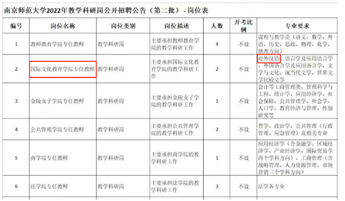 注:此處僅顯示“漢語國際教育”相關(guān)專業(yè)崗位,全部崗位信息請后臺回復(fù)“南京師范”獲取。2.報(bào)名時(shí)間、地點(diǎn)、方式網(wǎng)上報(bào)名,應(yīng)聘人員通過“江蘇省屬事業(yè)單位公開招聘平臺”報(bào)名,照片上傳、資格初審和繳費(fèi)確認(rèn)。https://rs.jshrss.jiangsu.gov.cn/index/f/RCRS_0056(江蘇省人力資源和社會(huì)保障廳網(wǎng)上辦事服務(wù)大廳)。2022年8月15日9∶00-2022年12月28日16∶00;(3)資格初審:2022年8月15日9∶00-12月29日16∶00;(4)陳述申辯:2022年8月15日-12月30日期間9∶00-16∶00;(5)對初審異議的處理:2022年8月15日9∶00-12月30日18∶00;(6)繳費(fèi)確認(rèn):2022年8月15日9∶00-12月31日12∶00。(1)應(yīng)聘人員網(wǎng)上提交報(bào)名信息24小時(shí)后(節(jié)假日順延)可到報(bào)名網(wǎng)站查詢是否通過招聘部門(單位)資格初審。(2)本次公開招聘不收報(bào)名費(fèi)和考試費(fèi),通過初審即報(bào)名成功。(3)未按時(shí)在網(wǎng)上確認(rèn)報(bào)名資格、上傳照片、要求繳納報(bào)名費(fèi)而未繳的視為報(bào)名無效。(1)應(yīng)聘人員按崗位要求和網(wǎng)上提示,如實(shí)填寫有關(guān)信息,并上傳本人近期免冠正面二寸(35X45毫米)證件照,jpg格式,大小為20Kb以下。招聘部門(單位)根據(jù)應(yīng)聘人員提供的信息進(jìn)行審核。應(yīng)聘人員弄虛作假的,一經(jīng)查實(shí),即取消應(yīng)聘資格。(2)本次招聘為長期招聘,不設(shè)開考比例。自公告發(fā)布7個(gè)工作日之后,根據(jù)報(bào)名情況組織考核。學(xué)校將通過短信或電話等方式通知應(yīng)聘人員參加考核的時(shí)間和地點(diǎn)。應(yīng)聘人員須按照規(guī)定的時(shí)間和地點(diǎn)參加考核,否則按棄考處理。崗位招滿即止。(3)應(yīng)聘人員只能從崗位表選擇一個(gè)崗位報(bào)名。資格初審?fù)ㄟ^后,不可更改報(bào)名信息。未通過資格初審的應(yīng)聘人員,在報(bào)名期內(nèi),可以改報(bào)符合資格條件的其他崗位。應(yīng)聘人員要使用在有效期內(nèi)的第二代居民身份證進(jìn)行報(bào)名,報(bào)名與考場使用的身份證必須一致。(4)應(yīng)聘人員在報(bào)名時(shí)請?jiān)凇皩W(xué)習(xí)及工作經(jīng)歷”欄中補(bǔ)充填寫自己的研究方向、主要的論文著作(注明期刊名稱,年、期和起止頁碼,并標(biāo)明是第一作者或獨(dú)立作者或通訊作者〔導(dǎo)師為第一作者〕等信息)、研究課題(注明主持或參與以及排名、科研經(jīng)費(fèi)等信息)和科研獎(jiǎng)勵(lì)(注明排名、獎(jiǎng)勵(lì)級別等信息)等情況,未填寫論文及課題情況的視作無相關(guān)科研成果。(5)有下列情形之一的,請勿報(bào)名應(yīng)聘:①現(xiàn)役軍人、普通高校在讀非應(yīng)屆畢業(yè)生;②與事業(yè)單位負(fù)責(zé)人員有夫妻關(guān)系、直系血親關(guān)系、三代以內(nèi)旁系血親關(guān)系或者近姻親關(guān)系等親屬關(guān)系的,不得應(yīng)聘事業(yè)單位的組織(人事)、紀(jì)檢監(jiān)察、審計(jì)財(cái)務(wù)崗位;與現(xiàn)有在崗人員存在上述關(guān)系的,不得應(yīng)聘到崗后形成直接上下級領(lǐng)導(dǎo)關(guān)系的管理類崗位,以及《事業(yè)單位人事管理回避規(guī)定》明確應(yīng)當(dāng)回避的崗位;③新《江蘇省事業(yè)單位公開招聘人員辦法》于2020年3月13日起施行,根據(jù)其后發(fā)布的事業(yè)單位公開招聘人員公告,被聘用到江蘇省地方各類事業(yè)單位3年服務(wù)期未滿的在編(在冊)人員;④2022年8月31日前,5年服務(wù)期未滿的新錄用公務(wù)員,或有規(guī)定(含協(xié)議明確)不得解聘離開工作單位(崗位)的人員,或國家和省另有規(guī)定不得應(yīng)聘到事業(yè)單位的人員。1.資格復(fù)審:考核前,我校將對應(yīng)聘人員進(jìn)行資格復(fù)審,應(yīng)聘人員須提交下列材料原件和復(fù)印件:(1)最高學(xué)歷、學(xué)位證書,身份證,專業(yè)技術(shù)職務(wù)資格證書;(2)國內(nèi)應(yīng)屆畢業(yè)生提供所在院校出具的省級教育行政部門統(tǒng)一印制的《畢業(yè)生雙向選擇就業(yè)推薦表》,留學(xué)回國人員提供留學(xué)回國人員證明及教育部留學(xué)服務(wù)中心出具的《國(境)外學(xué)歷學(xué)位認(rèn)證書》。2.考核方式:所有教學(xué)科研崗位的考核方式均為面試。按照南京師范大學(xué)自行制定的辦法執(zhí)行,主要測試履行崗位職責(zé)所需的專業(yè)知識、業(yè)務(wù)能力和綜合素質(zhì)。面試成績合格線為70分(滿分100分),面試成績當(dāng)場告知考生??偝煽兗礊槊嬖嚦煽?。1.考試結(jié)束后,根據(jù)總成績計(jì)算方法確定應(yīng)聘人員的總成績,在各單項(xiàng)考試(測試)合格人員中,按招聘崗位擬招聘人數(shù)1:1的比例從高分到低分確定參加體檢人員。體檢標(biāo)準(zhǔn)參照《國家公務(wù)員錄用體檢通用標(biāo)準(zhǔn)(試行)》執(zhí)行。