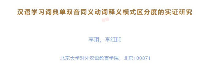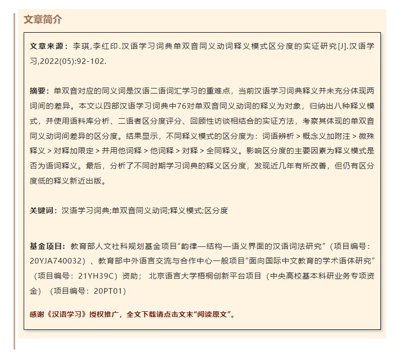 好文薦讀|李琪、李紅印:漢語(yǔ)學(xué)習(xí)詞典單雙音同義動(dòng)詞釋義模式區(qū)分度的實(shí)證研究 2023年03月20日