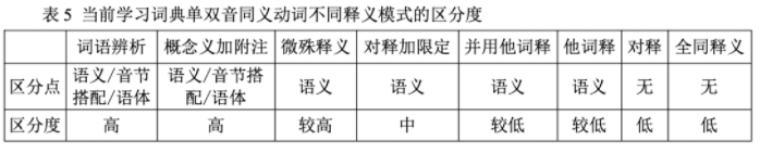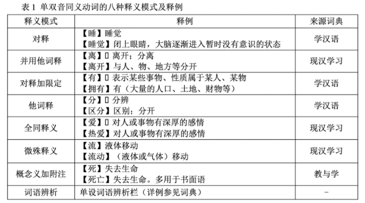 詞語(yǔ)辨析、概念義加附注適用于呈現(xiàn)單雙音同義動(dòng)詞語(yǔ)義、音節(jié)搭配、語(yǔ)體的區(qū)分,區(qū)分度最高對(duì)釋和全同釋義對(duì)于呈現(xiàn)任一方面的差異都是不太適用的;其他四種都屬概念義釋義模式,僅適用于呈現(xiàn)單雙音同義動(dòng)詞的語(yǔ)義差異,但這并不能說(shuō)明這幾種釋義模式的區(qū)分度相應(yīng)較低,因?yàn)橛械膯坞p音同義動(dòng)詞間只有語(yǔ)義差異,若這幾種模式能呈現(xiàn)其語(yǔ)義差異,仍然是區(qū)分度較高的釋義模式。因此,這四種釋義模式的區(qū)分度還需進(jìn)一步討論。