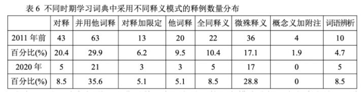 如上所述,學(xué)習(xí)詞典中單雙音同義動(dòng)詞的釋義模式應(yīng)該具有足夠高的區(qū)分度。因此,在理想的學(xué)習(xí)詞典中,應(yīng)優(yōu)先選用詞語(yǔ)辨析和概念義加附注這兩種釋義模式以體現(xiàn)單雙音同義動(dòng)詞間的差異,這兩種模式也是學(xué)習(xí)詞典區(qū)別于傳統(tǒng)語(yǔ)文詞典的特點(diǎn),是“學(xué)習(xí)性”的體現(xiàn)。但理想和現(xiàn)實(shí)存在差距,以詞語(yǔ)辨析為例,該模式需占據(jù)詞典一定篇幅,對(duì)每對(duì)詞進(jìn)行辨析勢(shì)必影響詞典(特別是紙質(zhì)詞典)的經(jīng)濟(jì)性原則。且考慮到同義詞間的差異表現(xiàn)不同,有的同義詞差異表現(xiàn)較多,涉及到語(yǔ)義、音節(jié)搭配、語(yǔ)體等多個(gè)方面,或是二語(yǔ)者易產(chǎn)生群體性混淆的“易混淆詞”,單獨(dú)設(shè)欄進(jìn)行辨析確有必要,而對(duì)于差異表現(xiàn)較少,如僅有音節(jié)搭配或語(yǔ)體差異,可選擇概念義加附注模式;如僅有細(xì)微的語(yǔ)義差異,則應(yīng)按需選取其他適宜的概念義釋義模式,如區(qū)分度較高的微殊釋義模式或?qū)︶尲酉薅J?/span>。至于并用他詞釋和他詞釋這兩種語(yǔ)詞釋義的模式,易使二語(yǔ)者產(chǎn)生困惑,無(wú)法清晰地區(qū)分同義詞間的差異,選用其進(jìn)行釋義時(shí)應(yīng)審慎考慮。而對(duì)釋和全同釋義這兩種模式,經(jīng)語(yǔ)料庫(kù)和實(shí)驗(yàn)驗(yàn)證區(qū)分度都最低, 也應(yīng)考慮是否舍棄。為了更清楚地探究學(xué)習(xí)詞典對(duì)單雙音同義動(dòng)詞釋義模式的選擇問(wèn)題,我們按出版時(shí)間將 所考察的四部學(xué)習(xí)詞典分為兩類,一類為 2010 年前出版的三部詞典(《學(xué)漢語(yǔ)》《現(xiàn)漢學(xué) 習(xí)》《教與學(xué)》),一類為 2020 年新近出版的《當(dāng)代學(xué)習(xí)》,并從歷時(shí)的角度探究學(xué)習(xí)詞 典對(duì)不同釋義模式的選擇變化。