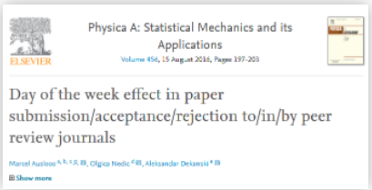 2016年8月15日,著名的統(tǒng)計(jì)學(xué)應(yīng)用期刊“Physica A: Statistical Mechanics and its Applications ”在線出版了這篇文章,文章全名為“Day of the week effect in paper submission/acceptance/rejection to/in/by peer review journals”,中文譯名為《在同行評議期刊中的文章接受投遞/接受/拒稿的星期幾效應(yīng)》。