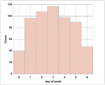 研究人員收集了在2013年和2014年期間通過電子方式投稿至《塞爾維亞化學(xué)學(xué)會雜志》(JSCS,在2012年的影響因子為0.912)的文章情況,收集到的文章總數(shù)為596篇。下圖是JSCS期刊在2013年至2014年期間收到的所有按星期分類的SCI稿件數(shù)量。