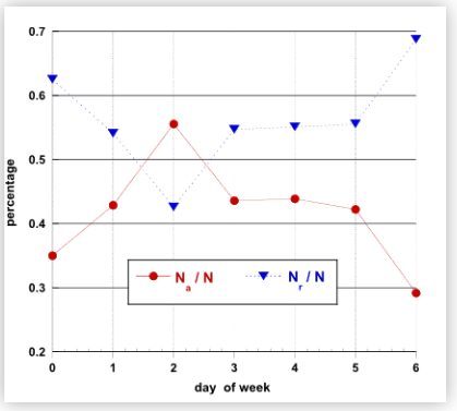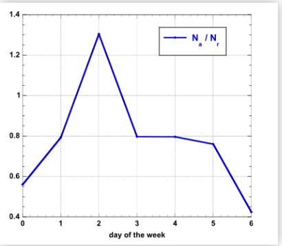 此外,在得出上圖之后,研究人員又使用“Na/Nr”作為“接受/拒稿率”對“周二效應(yīng)”形成了直觀描述,如下圖所示。